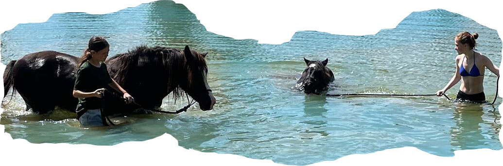Je leert ook over de invloed van je ademhaling, gewichtsverplaatsing, het gebruik van de verschillende drukpunten op het paardenlichaam. En als het nivo het toelaat start je met rijden met halster en/of neckrope en stick in de tweede of derde week. Naast de twee uur les per dag mag je je paard of pony ook begeleiden tijdens een beginnersles zodat je het geleerde in praktijk kunt brengen. We maken tochtjes over het terrein en in de directe omgeving. Ook dan doen we verschillende oefeningen: bijvoorbeeld over een boomstam of greppel springen etc. Als kers op de taart gaan we het water in met de paarden en pony’s. Soms erop, soms ernaast.