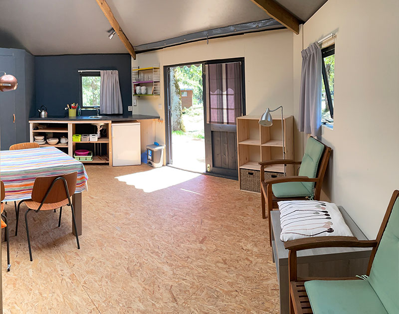 • Tenthuisje, geschikt voor max. 4 personen. Het tenthuisje heeft inpandig douche/toilet en keukenblok met koelkast, warm en koud stromend water, een 2-persoonsbed en een stapelbed, afgescheiden door een houten wand